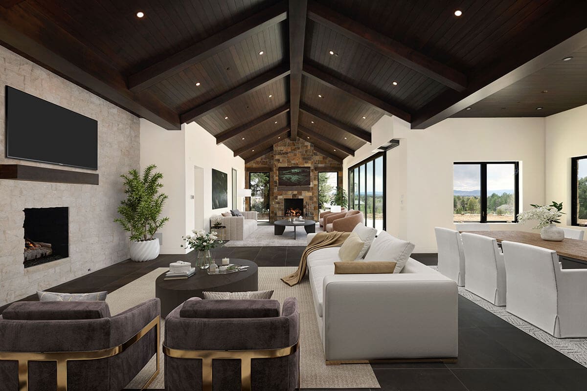 living room, dining room, and sitting area in open concept home with contemporary dark roof, nano doors, and off-white walls ONE Residential Builders Denver