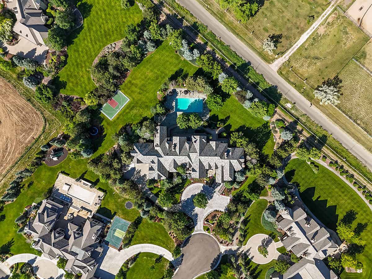 aerial view of Greenwood Village, Colorado home with downtown Denver in background ONE Residential Builders Denver extra large kitchen in new home with dual islands, marble vent hood, and coffered ceiling ONE Residential Builders Denver home's unique features include wood dining table with chairs and wood bench, unique wallpaper, and ornament-like chandelier ONE Residential Builders Denver large living room with wood trusses and marble columns, wood floors, and large light fixtures ONE Residential Builders Denver bathroom with Colorado flair with a lot of cabinet storage, opposite side sinks and large soaking tub ONE Residential Builders Denver new home patio with large fire place, modern wicker furniture, tile flooring and pool ONE Residential Builders Denver true aerial view of new home build highlighting new roof, pool, mature trees, and sport court with neighbors to either side ONE Residential Builders Denver