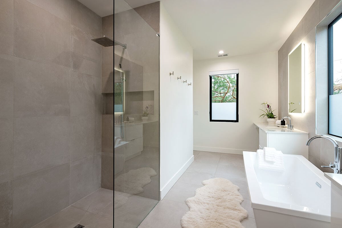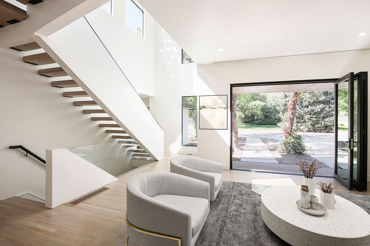 older home gets major remodel and addition from ONE Residential Builders Denver floating stairs and nano doors highlight this home by ONE Residential Builders Denver modern cabinets, chairs, nano doors, and large island highlight this home by ONE Residential Builders Denver modern home open concept of kitchen, dining room, and sitting area with view of outdoors ONE Residential Builders Denver new bathroom with modern fixtures, white sink and tub ONE Residential Builders Denver